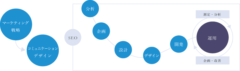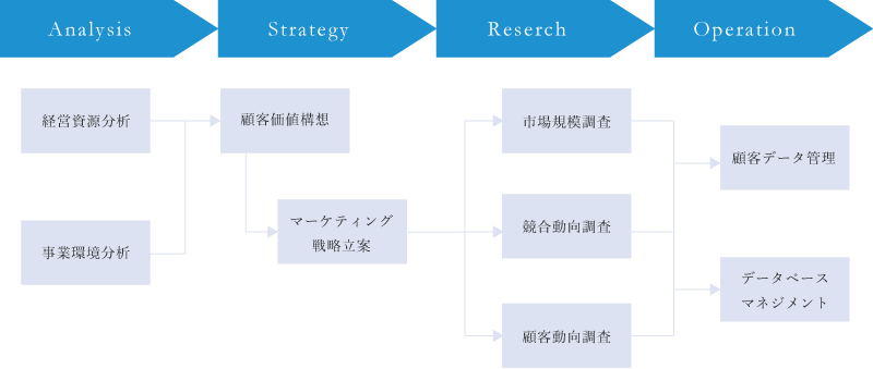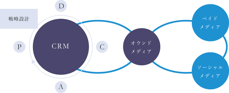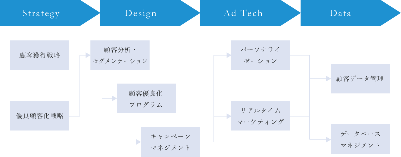 我々は、貴社の顧客の生涯価値を最大化するCRM戦略の立案から、コミュニケーションのデザインおよび実行する仕組み作りまでを支援いたします。