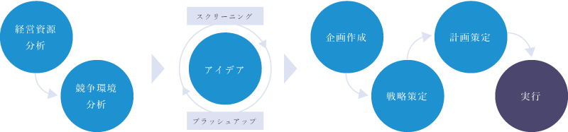我々は企業を取り巻く環境分析、自社の持つケイパビリティの評価など、既存事業における優秀な人材が不得手な分野をサポートしながら、進出すべき分野、商品・サービスの方向性を貴社メンバーと導き出し、また事業の成功確率を高めるための考え方を貴社メンバーにインストールしながら、新規事業開発の支援を行います。